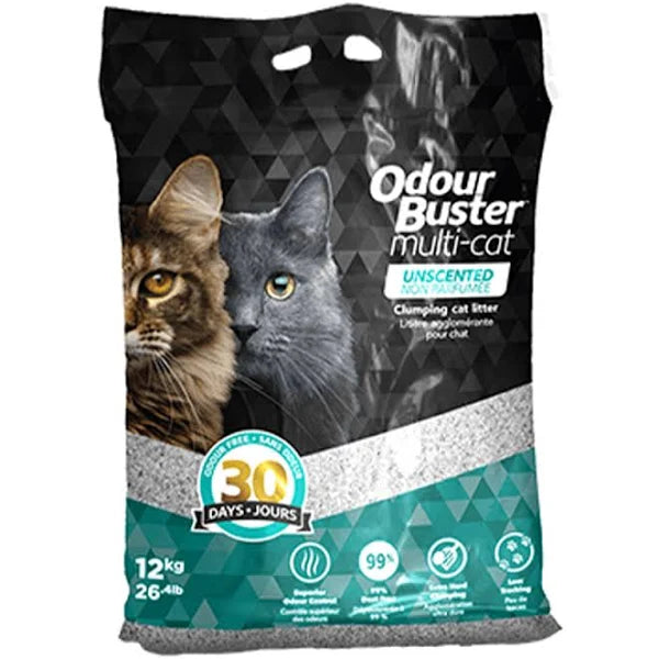 Odour Buster Multi-Cat is an premium, clumping cat litter made from superior-quality clay. It is Odour Buster's most technologically advanced formula yet! Thanks to the latest manufacturing techniques and the exclusive odour eliminating recipe, Odour Buster Multi-Cat is the most dust-free and odour-free cat litter on the market. Odour Buster Multi-Cat creates extra-hard clumps quickly that are easy to scoop. Because the clumps don’t break apart, the remaining litter stays clean and odour-free. It’s perfect for use in litter boxes that have lots of traffic. Format Odour Buster Multi-Cat is available in a 12Kg bag with a convenient carry handle. Composition Odour Buster Multi-Cat is made from responsibly-mined, premium-quality bentonite clay. Odour Buster Multi-Cat is proudly made in Canada using premium quality ingredients that are safe for your cat, family and the environment.