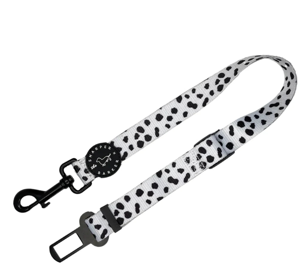 Keep your dog secure in the car with this stylish Dalmatian print seatbelt tether. It features a swiveling metal clip and a universal belt clip compatible with most vehicles.
